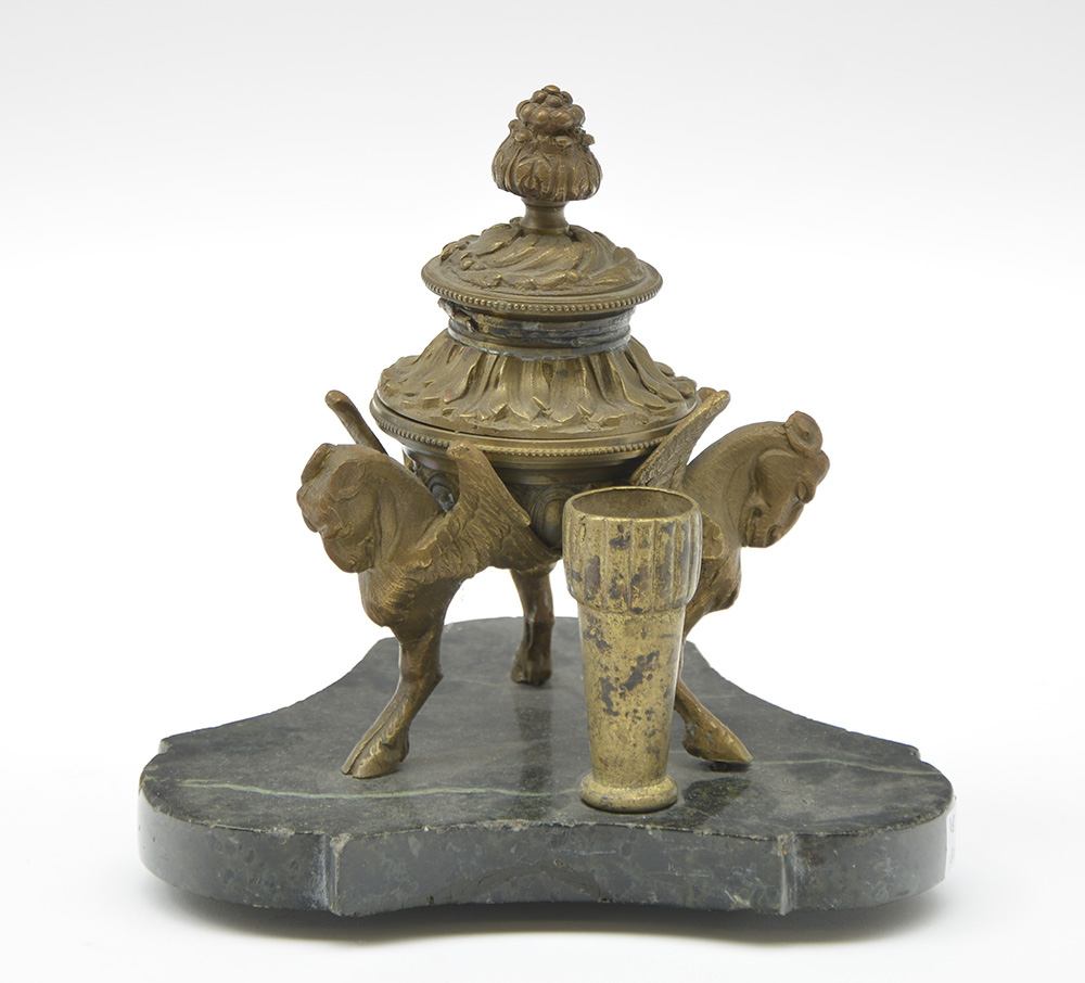 Calamaio in bronzo con vasca sormontata da animali fantastici (h. cm 15) Poggiante su base in marmo verde di epoca posteriore
