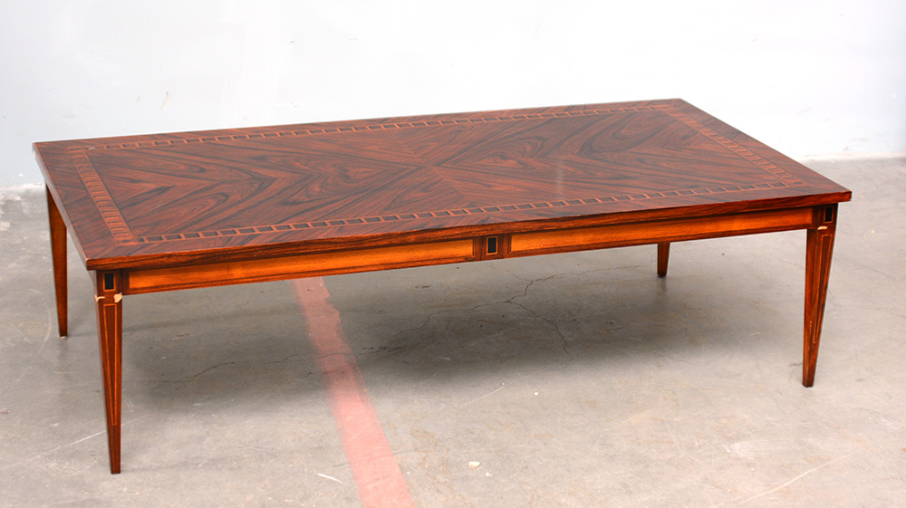 Tavolino rettangolare da salotto con gambe rastremate decorato con filettature e piccoli intarsi (cm 135x38x71) (lievi difetti)