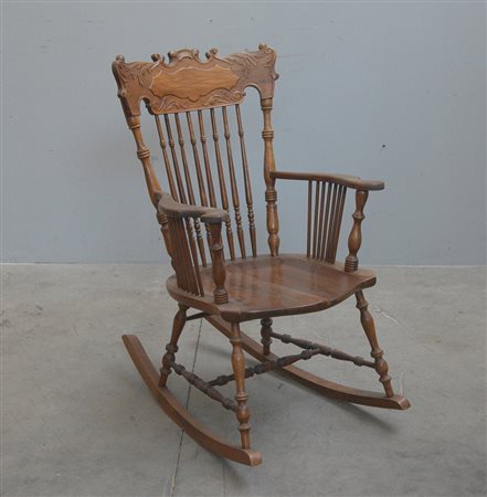 Poltrona a dondolo con schienale sagomato e intagliato. Montanti torniti