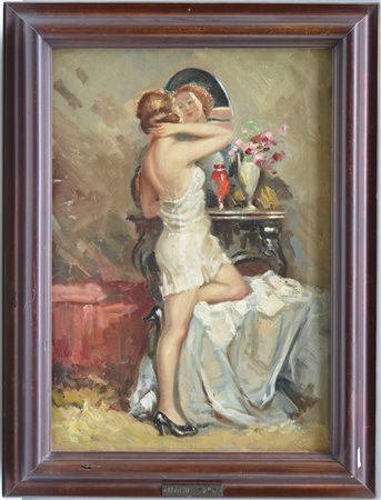 Attilio Toro (Napoli 1892 - 1982) (Attribuito) "Donna allo�� specchio" olio su tela (cm 50x35) Provenienza: Luigi Fumagalli Antichità, Lecco (difetti)