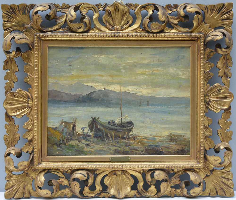 Federico Maragliano (Genova 1873 - 1952) "Litorale con barca" olio su tela (cm 35x50) tracce di firma in basso a sinistra. In cornice in legno traforato e dorato