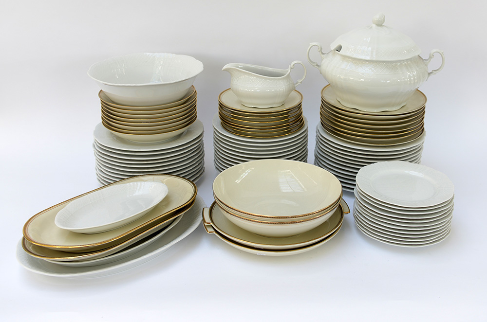 Manifatture tedesche, lotto composto da un servizio da tavola per dodici commensali e una parte di servizio con profili dorati in porcellana (lievi difetti)