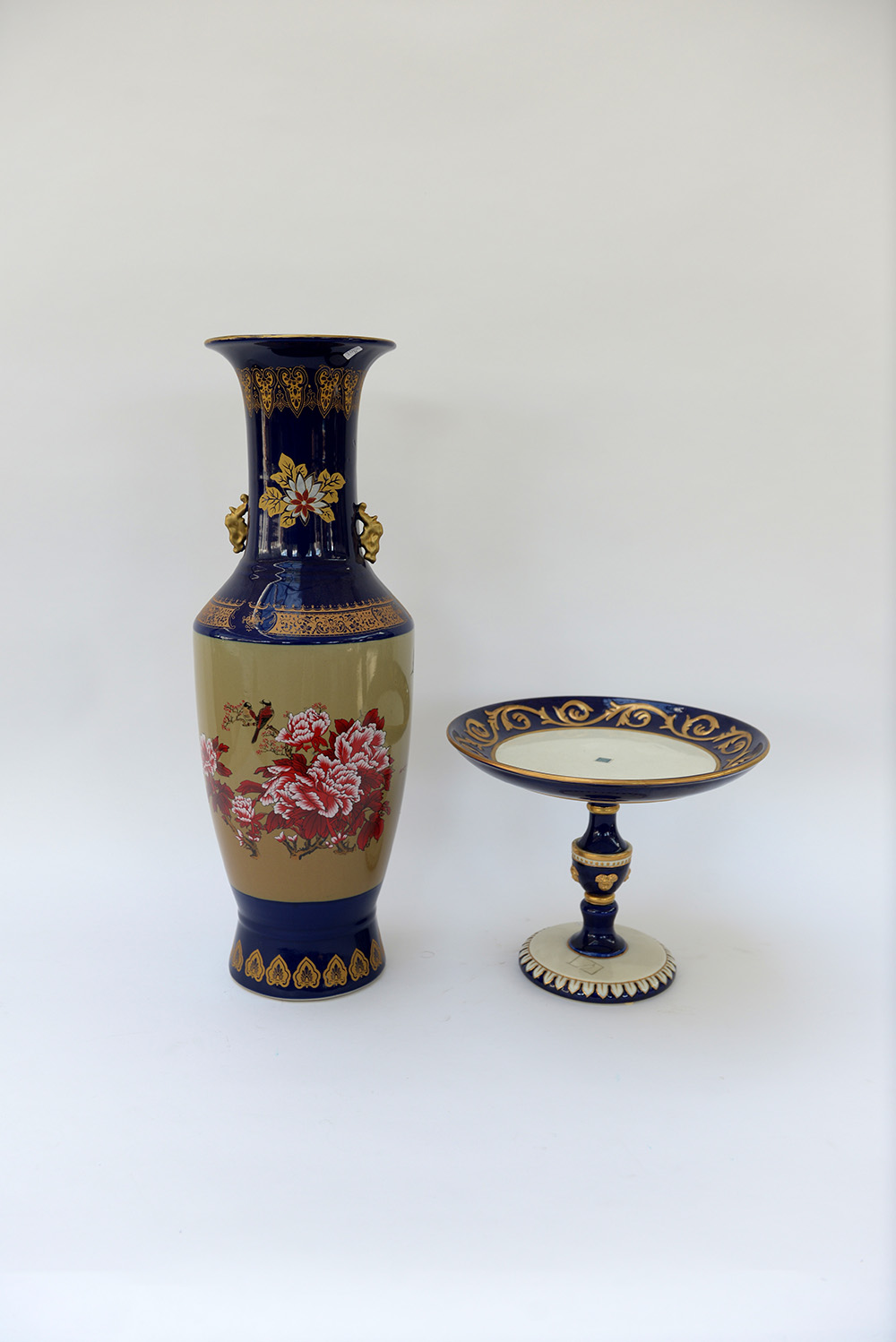 Lotto composto da un vaso a balaustro in ceramica con decoro orientale (h cm 61) e un'alzatina con decori oro e blu (h cm 25) (lievi difetti)