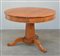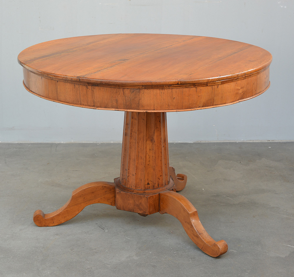 Tavolo da centro in legno chiaro, piano circolare con gamba centrale scanalata e tre piedi a sagoma. Secolo XIX (d cm 109, h cm 78) (difetti)