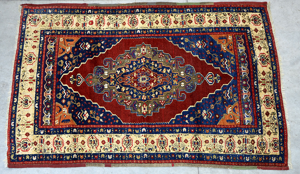 Tappeto Anatolia sec. XX Disegno a medaglione lanceolato su fondo ruggine bordura a fondo bianco (cm 185x126)(difetti)