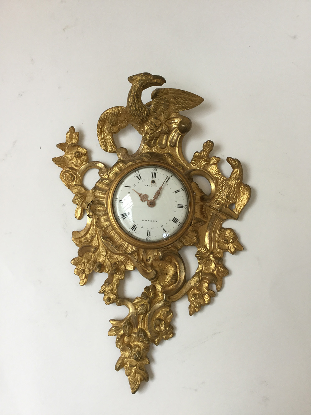 Piccolo orologio da muro in bronzo, moviemnto con carica a chiavetta, scappamento a verga, quadrante con numeri romani. (h cm 22) (difetti)