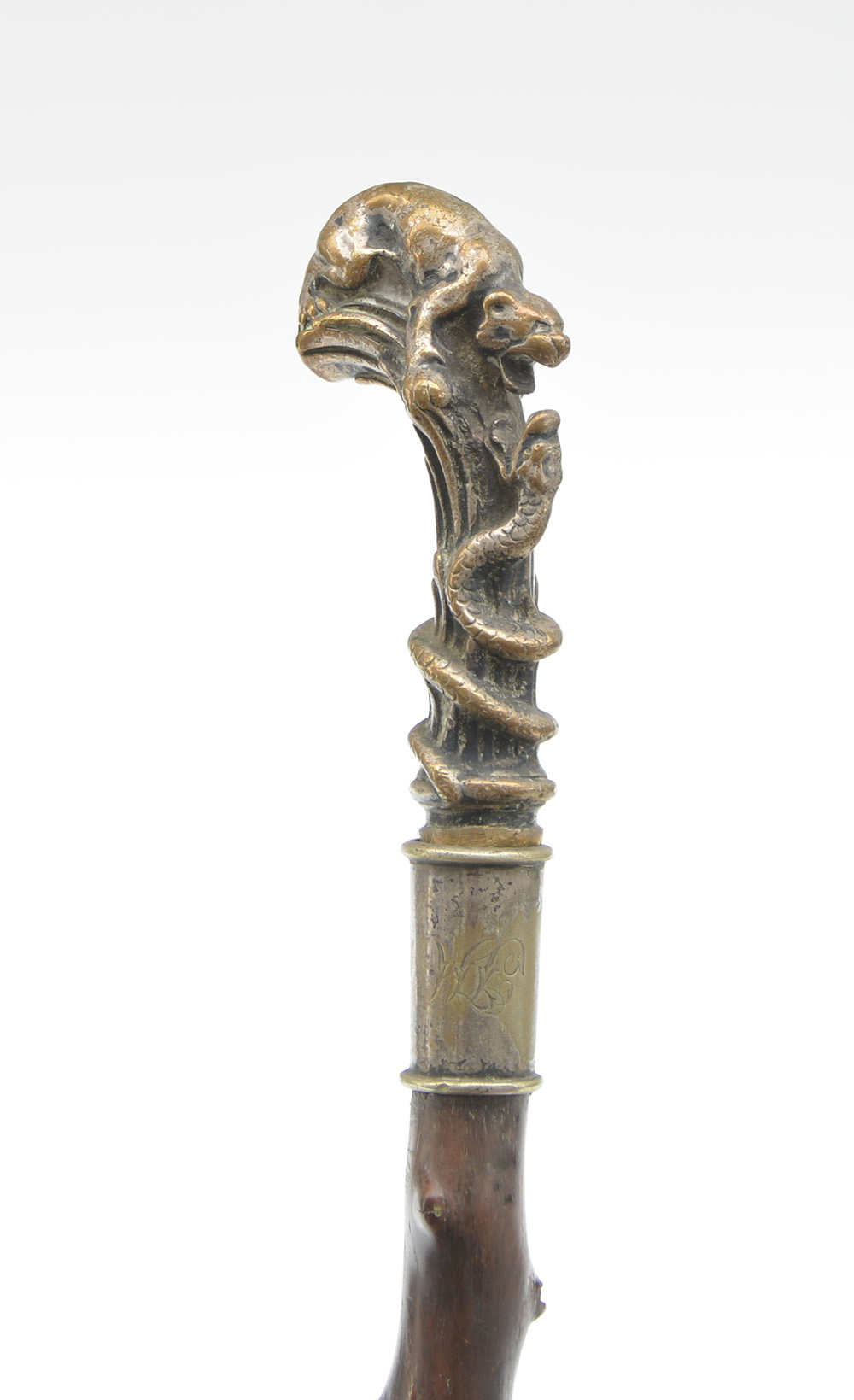 Bastone Liberty con pomolo in bronzo raffigurante una lotta tra un ghepardo e un serpente. Canna in legno di rosa