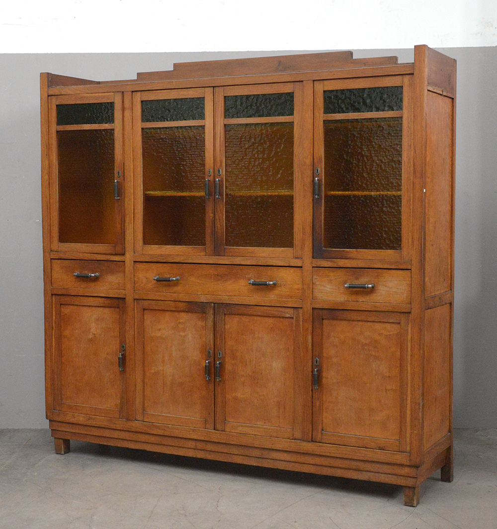 Mobile dispensa in castagno a tre cassetti con parte inferiore a quattro battenti, parte superiore a quattro sportelli con vetri colorati. Prima metà del secolo XX (cm 195x194x48) (difetti)