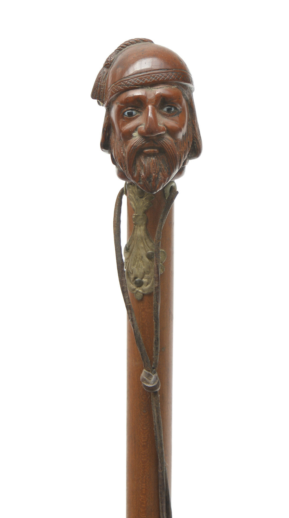 Bastone con presa in legno intagliato a uomo con cappello e occhi in vetro policromi (difetti)