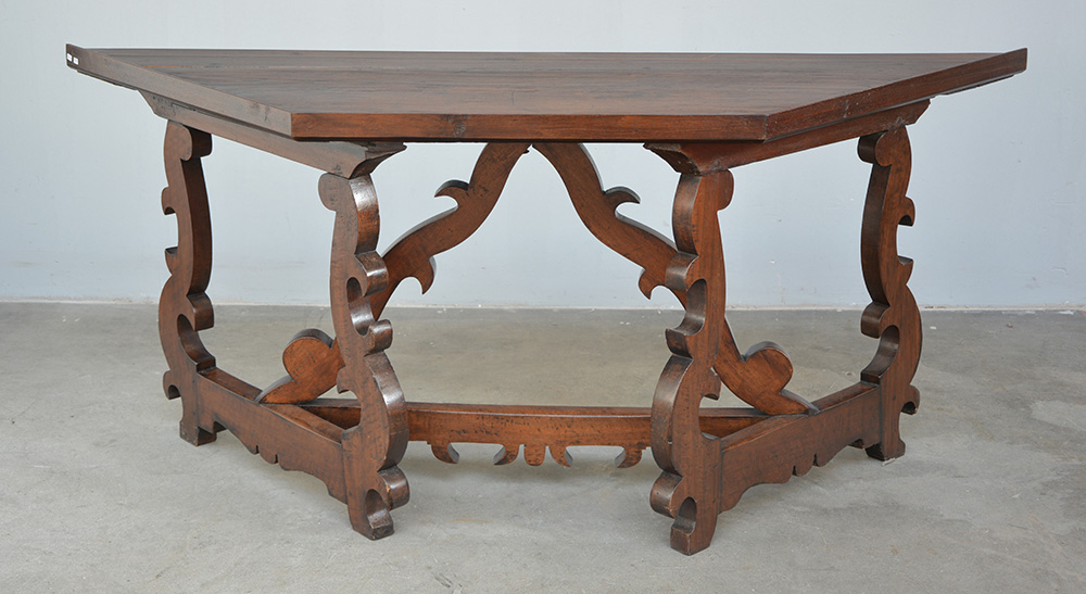 Console in noce con piano a trapezio e sostegni a lira intagliati a volute con traverse analoghe (cm 170x70x55)