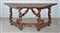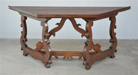 Console in noce con piano a trapezio e sostegni a lira intagliati a volute...