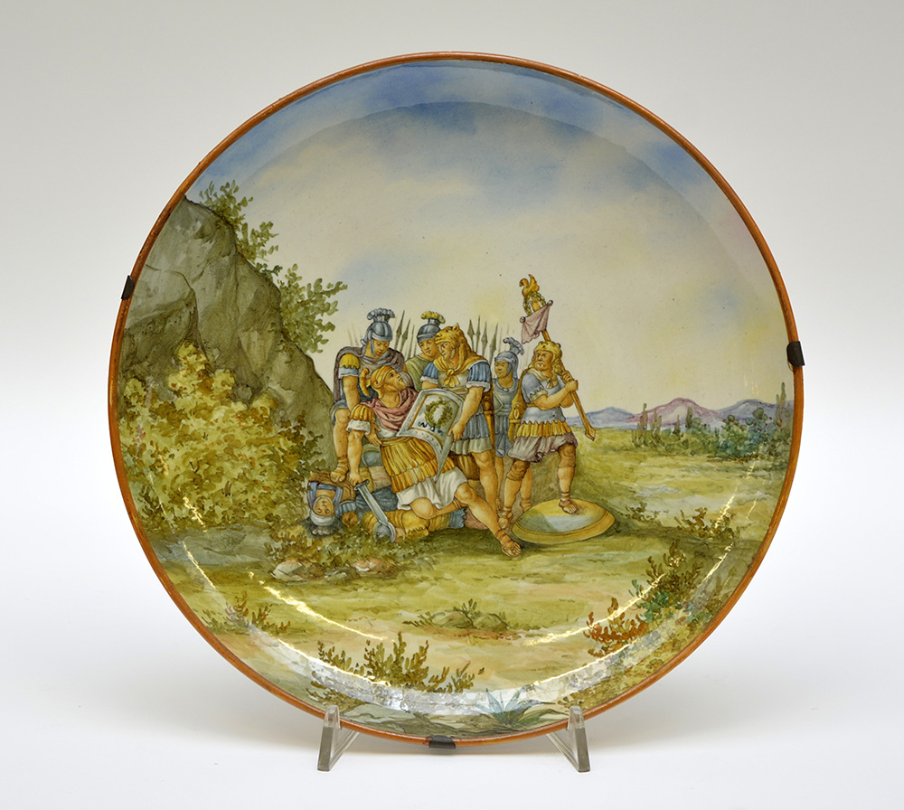 Manifattura di Ginori, inzio secolo XX "Calpurnio Fiamma Tribuno viene trovato moribondo dai suoi compagni" piatto in ceramica decorato in policromia (d. cm 30)