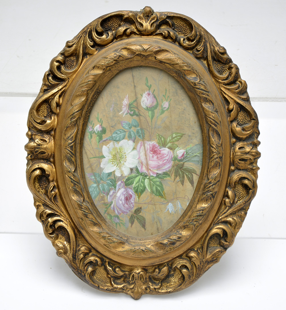 Scuola del secolo XIX "Fiori" dipinto ovale su seta (cm 12x9) In cornice dorata