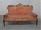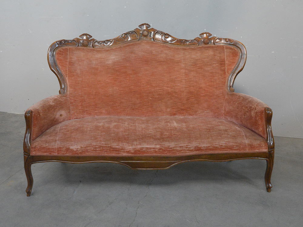 Divano a tre posti con struttura mossa in noce intagliato e imbottitura rivestita in velluto color salmone. Fine secolo XIX (difetti)