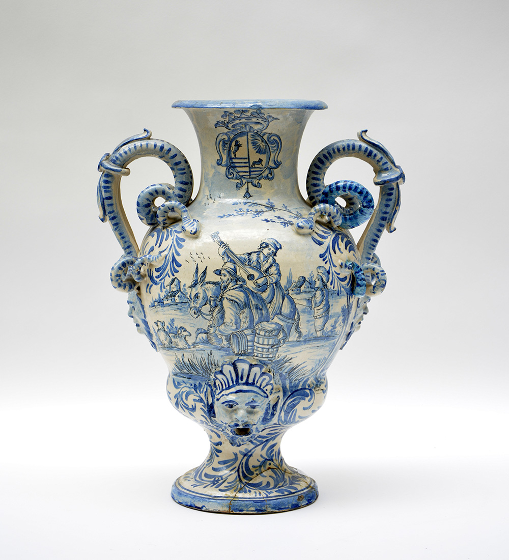 Manifattura italiana, secolo XVIII. Vaso biansato in terraglia decorato in monocromia a viandanti in un paesaggio e stemma nobiliare. Anse decorate con serpenti avviluppati e rubinetto a mascherone (h. cm 45) (difetti e restauri)
