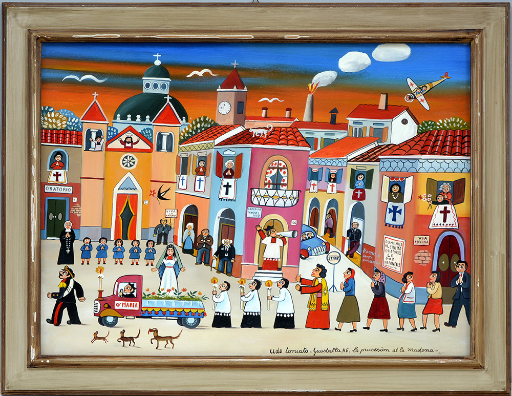 Udo Toniato (Borgoforte 1930 - Guastalla 2011) "Guastalla RE, la processione at la Madonna...." olio su masonite (cm 55x75) firmato e titolato in basso a destra, in cornice