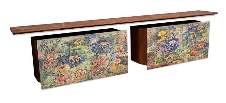Uno apribile a ribalta e l'altro a due ante, sormontati da una grande mensola a bordo rastremato anch’essa a sbalzo. Ante dipinte ad olio con soggetti marini, firmato C. Andreoni.