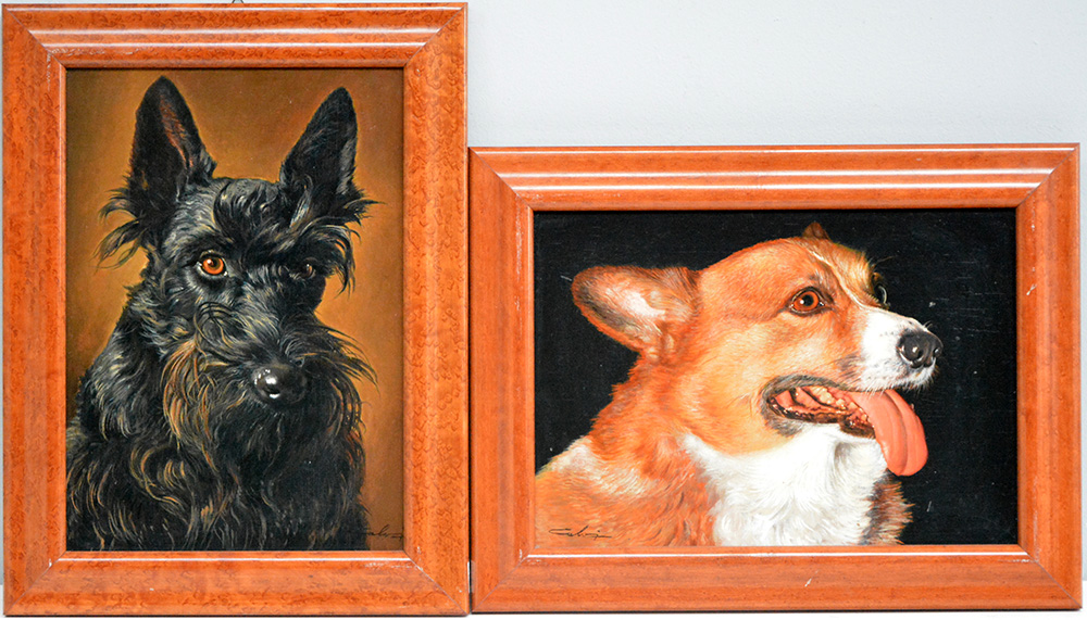 Firma indecifrata. Lotto composto da due dipinti di misure diverse raffiguranti cani. In cornici (difetti)