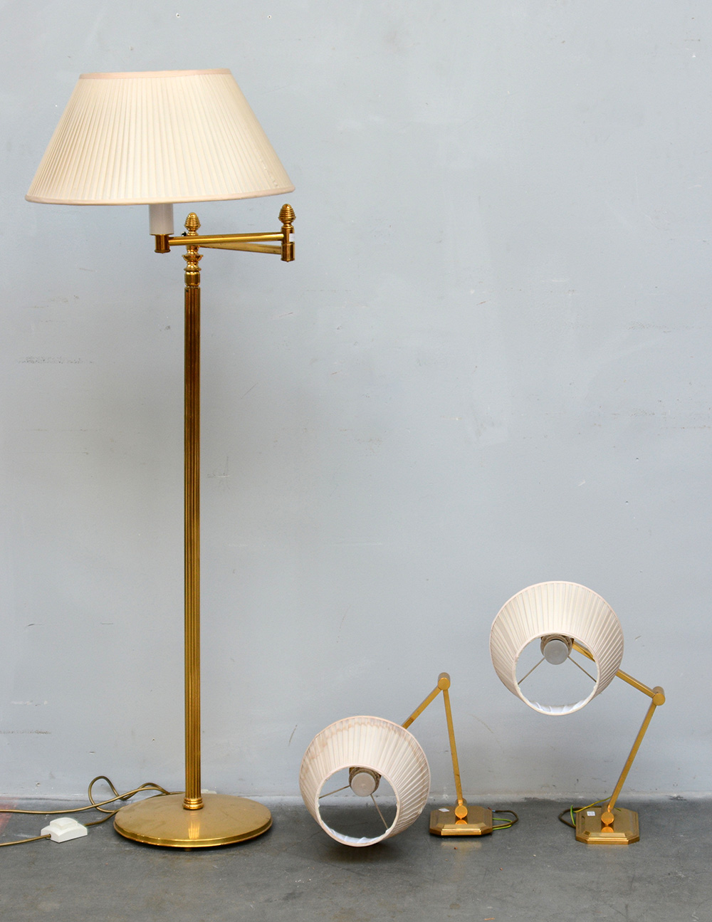 Lotto composto da una piantana e due appliques in ottone con braccia movibili (difetti)