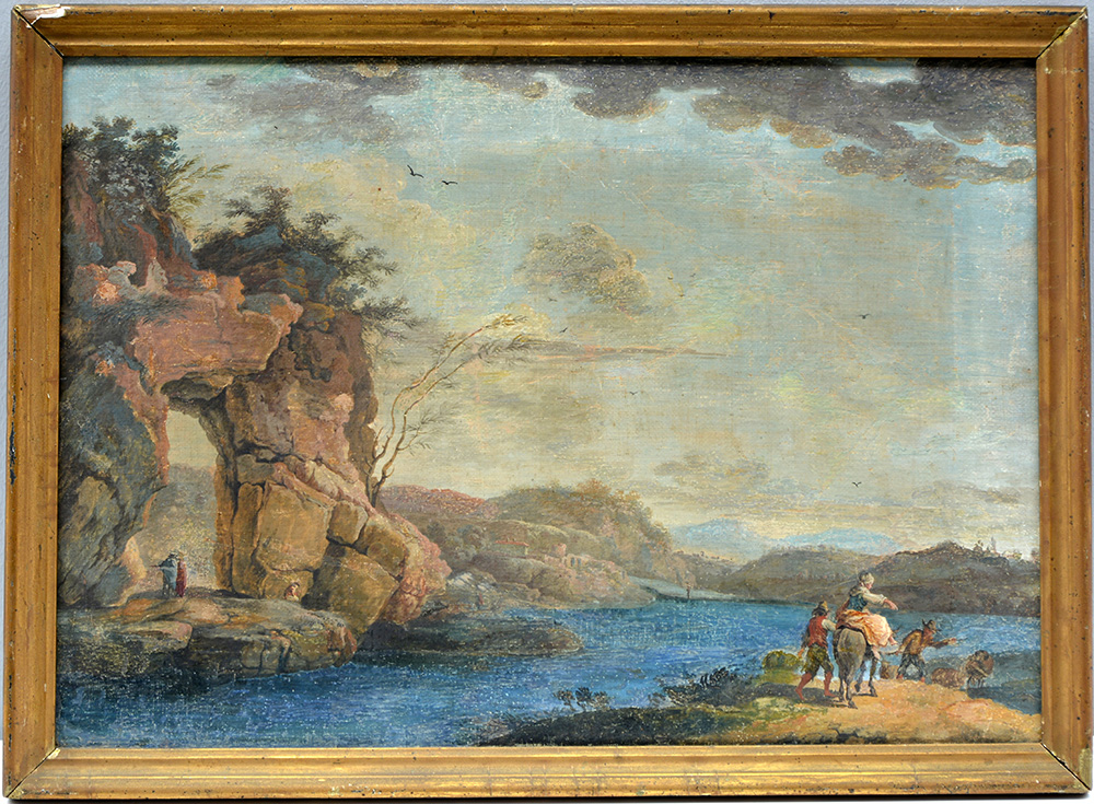Scuola veneta della fine del secolo XVIII "Paesaggio fluviale con viandanti" tecnica mista su tela (cm 34x49,5) in cornice (difetti e restauri)