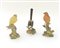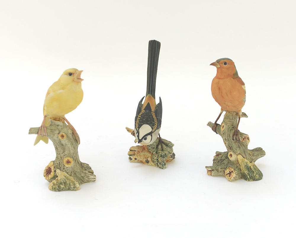 Gruppo di tre uccelli su rami in porcellana dipinta in policromia firmati sotto la base V. Bindi (lievi difetti)