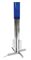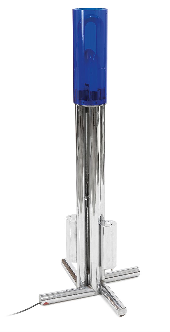 a supporto di due trasformatori e di due tubi al neon ad U, schermati da un cilindro in metacrilato blu. Sistema a carrucola per la traslazione verticale dei neon rientranti a vari livelli nel tubo di metacrilato.