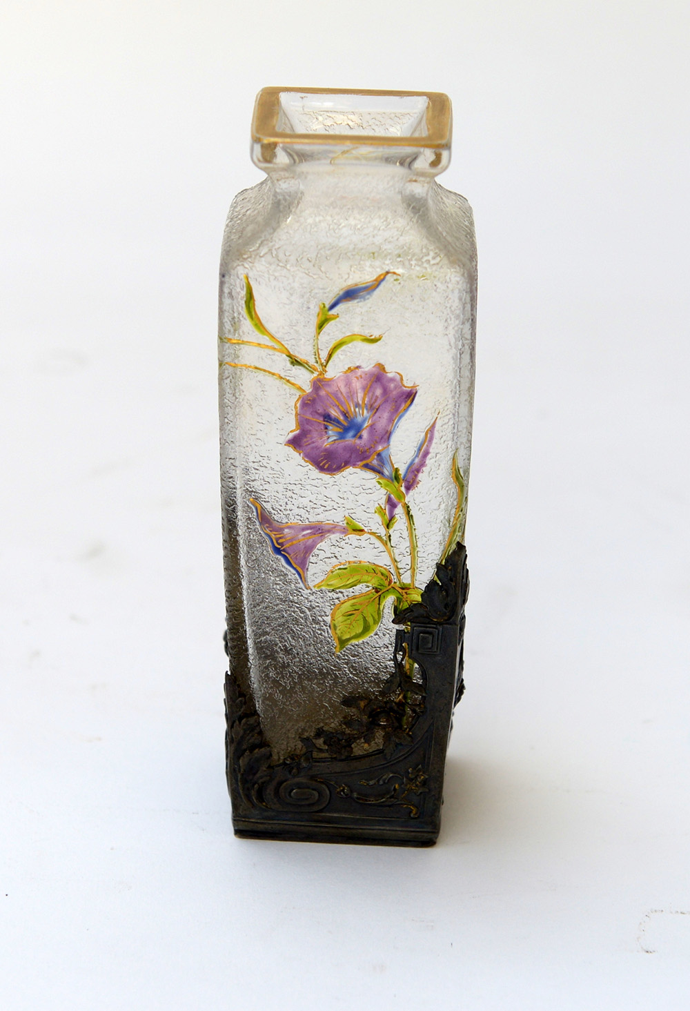 Manifattura del secolo XX, Vasetto in vetro decorato in policromia con ghiera in argento cesellato a motivi liberty (h cm 16) (difetti)