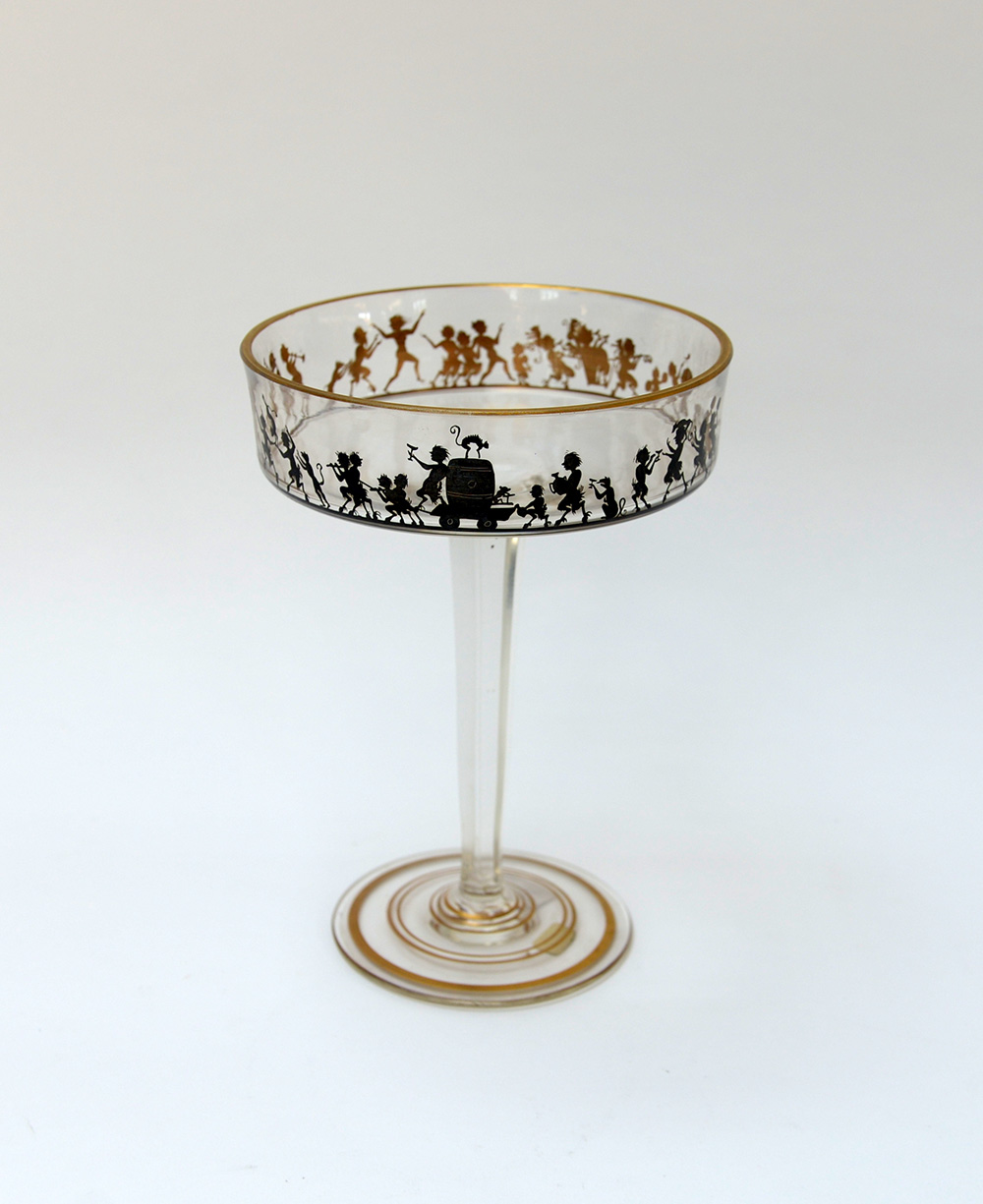 Alzatina in cristallo decorata a scene bacchiche e profilata in oro (h cm 20)
