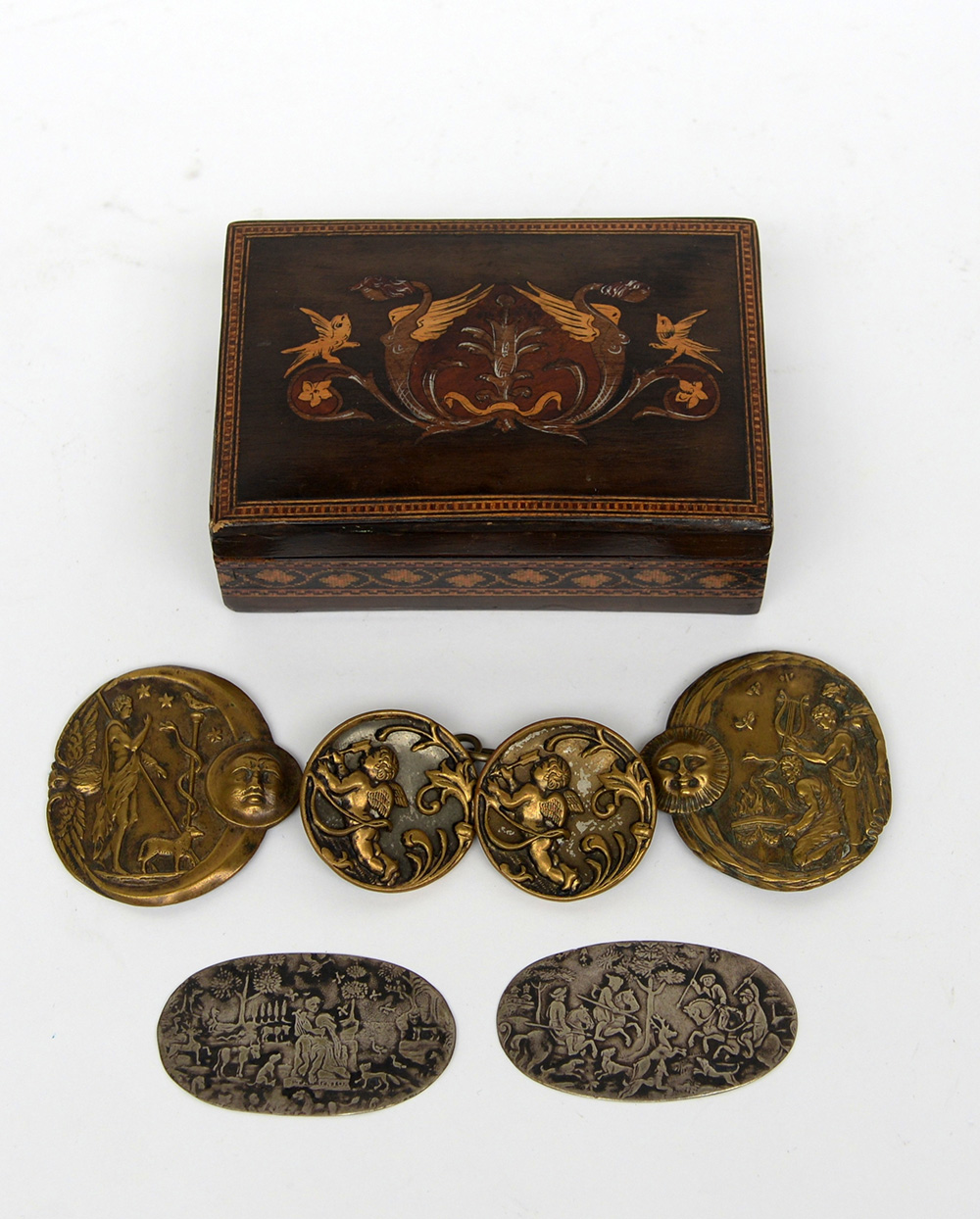 Lotto 3333 | Scatola contenente numerose fibbie e fregi in materiali diversi (difetti)