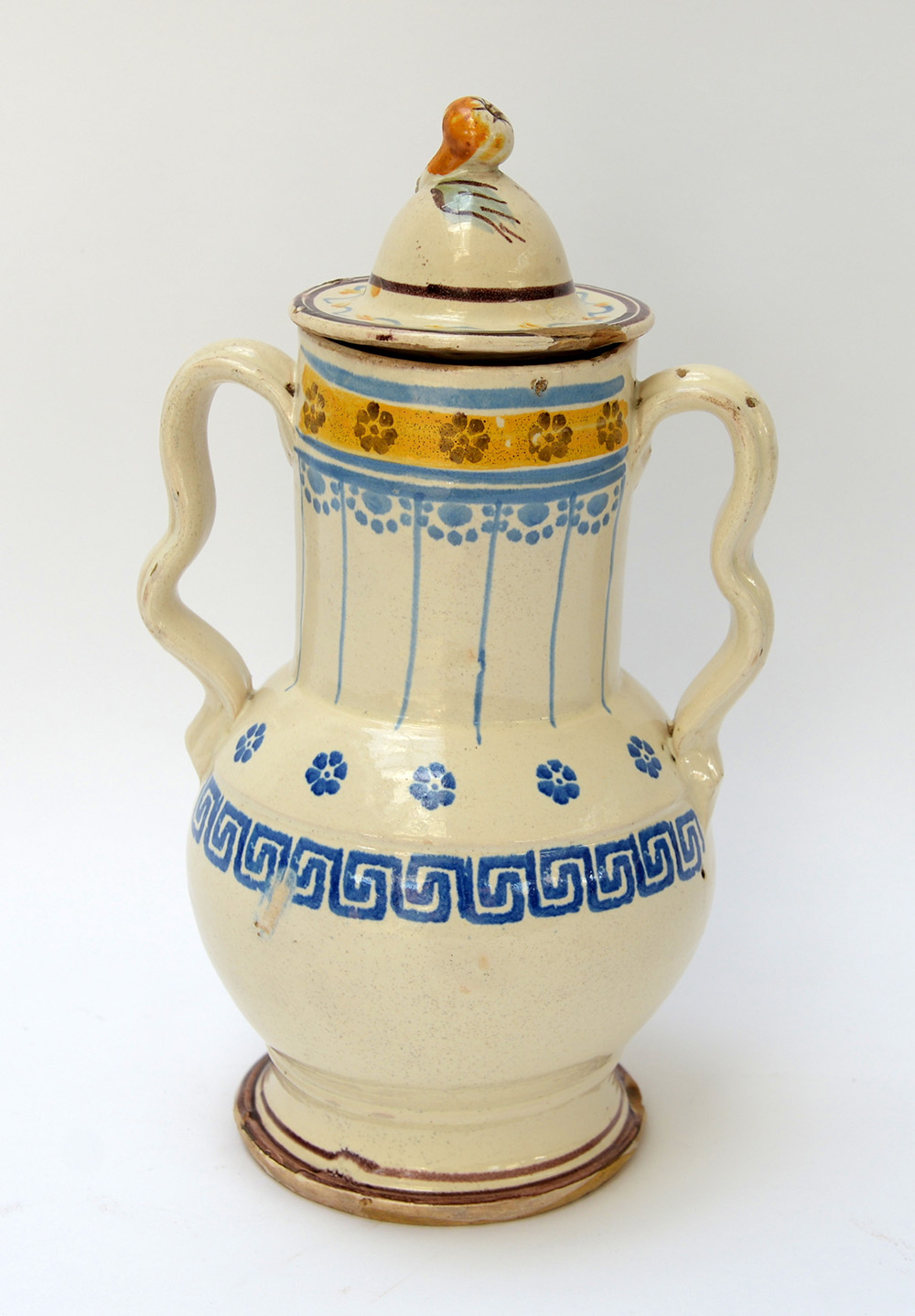 Vaso con coperchio in terraglia con anse sagomate e decori geometrici stilizzati. Secolo XVIII (h. cm 37) (difetti, coperchio non coevo)