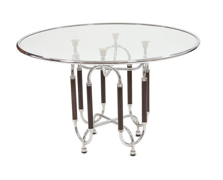 Tavolo in metallo cromato e legno di palissandro, piano in cristallo