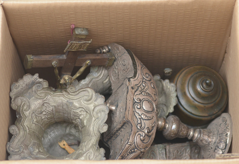 Cartone contenente numerosi oggetti di uso religioso in materiale diverso (difetti)