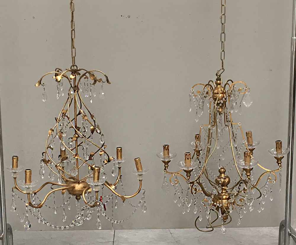 Lotto di due lampadari a sei luci con dtruttura in metallo dorato, perline e pendagli in cristallo (difetti)