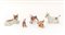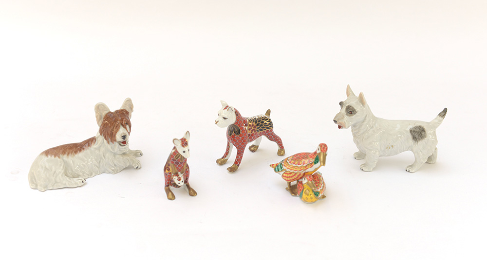 Lotto composto da due cani in porcellana della manifattura di Dresda e altre tre sculturine raffiguranti animali differenti (difetti)