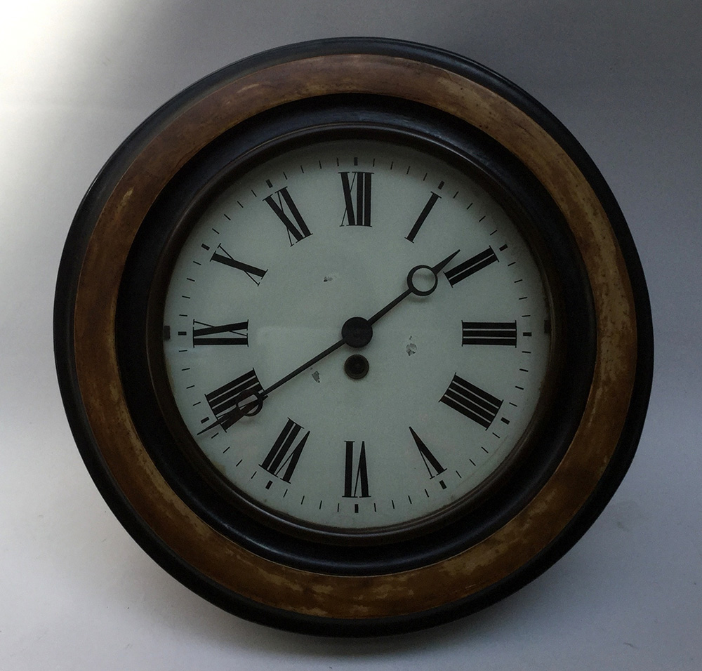 Orologio da parete occhio di bue in legno ebanizzato, quadrante in vetro con numeri romani, movimento con carica manuale solo tempo (d cm 38) (difetti)