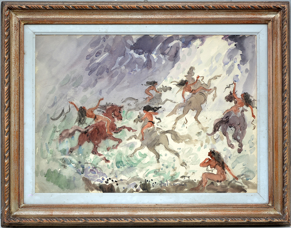 Giulio Falzoni (Marmirolo (MN) 1900 - Milano 1978) "Amazzoni al mare" acquerello su cartone (?) (cm 50x70) firmato in basso al centro, titolato, firmato e datato 1959 al verso. Timbro del Centro artistico milanese. In cornice (difetti)
