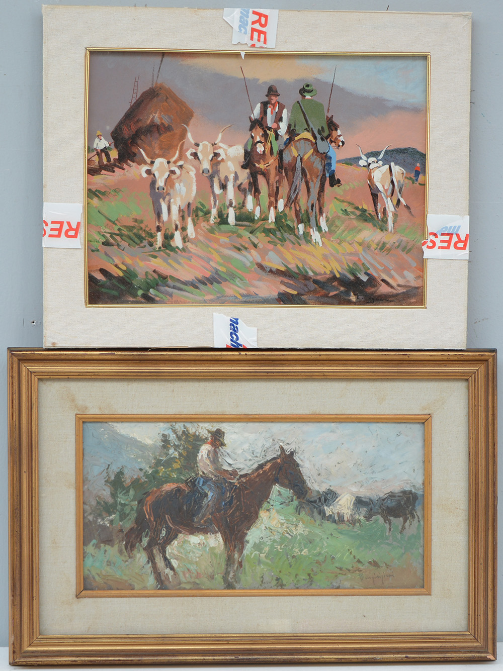 Lotto di due dipinti ad olio raffiguranti mandriani, di autori e misure...