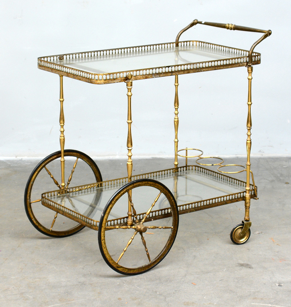 Carrello porta vivande in ottone a due ripiani in vetro (difetti)