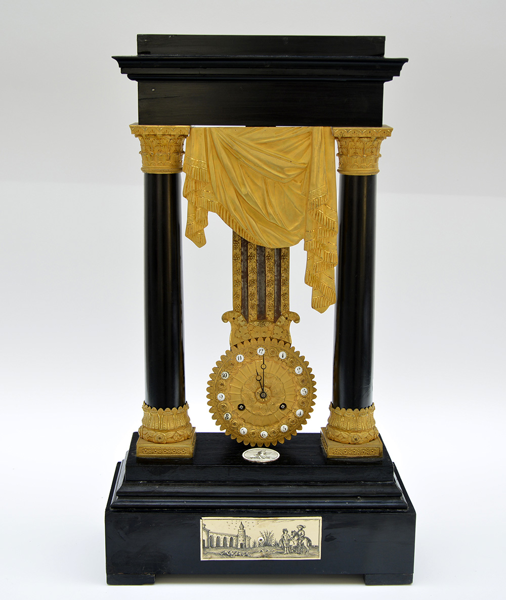 Pendola a due colonne in legno ebanizzato decorata con capitelli e fregi in...
