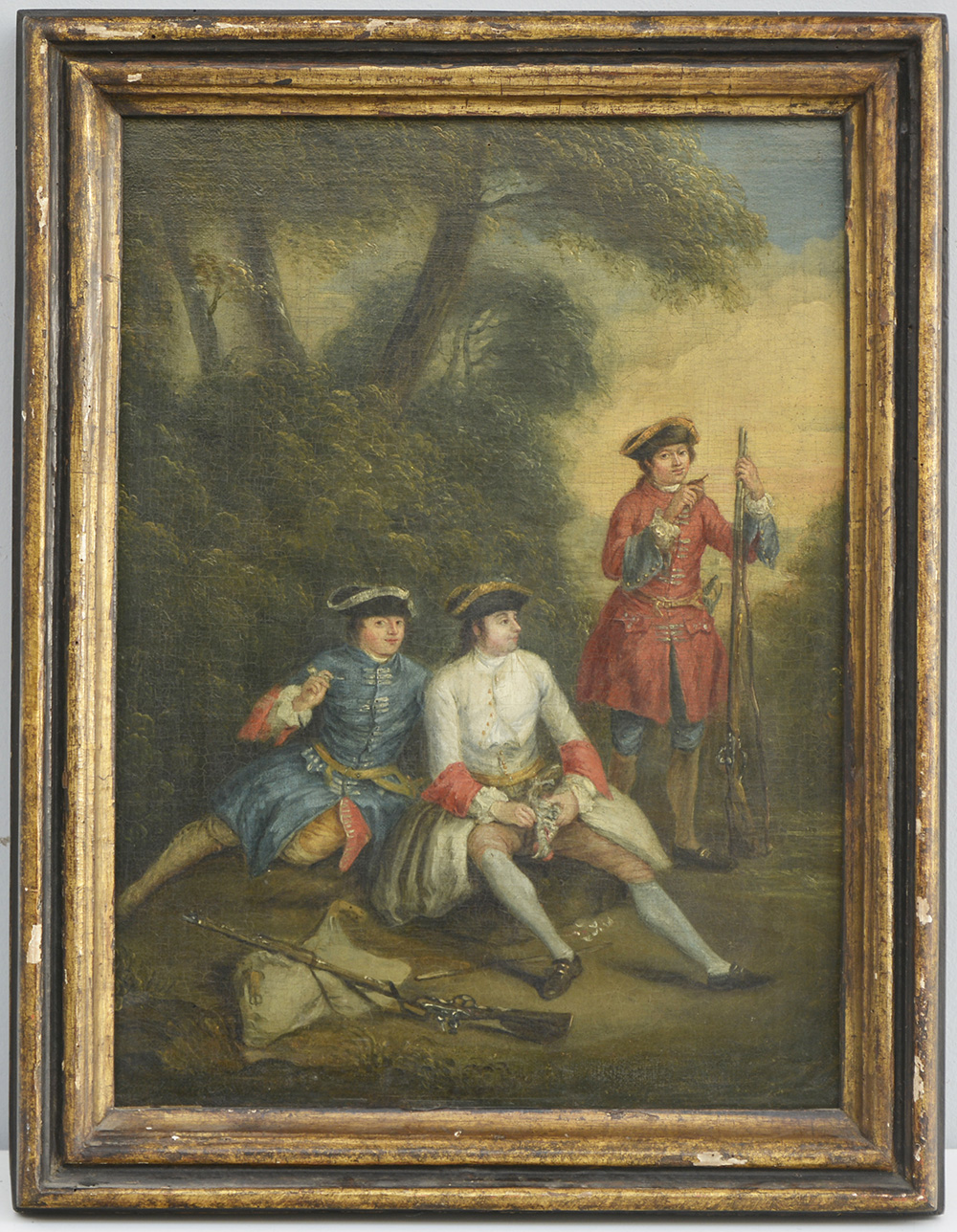 Scuola europea del secolo XVIII "Riposo durante la caccia" olio su tela (cm 50x38) in cornice (difetti)