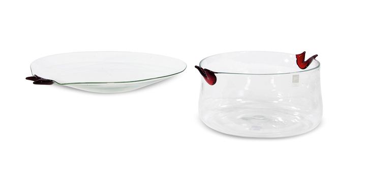Due contenitori in vetro soffiato trasparente con prese in vetro rosso applicato a caldo.