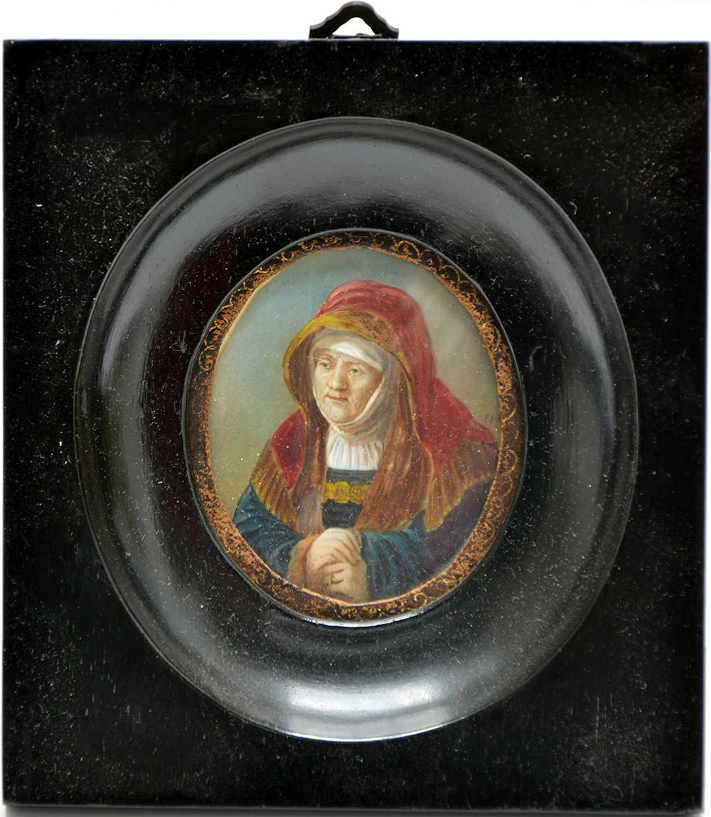 Firma indecifrata secolo XIX "Ritratto di anziana" miniatura ovale su avorio...