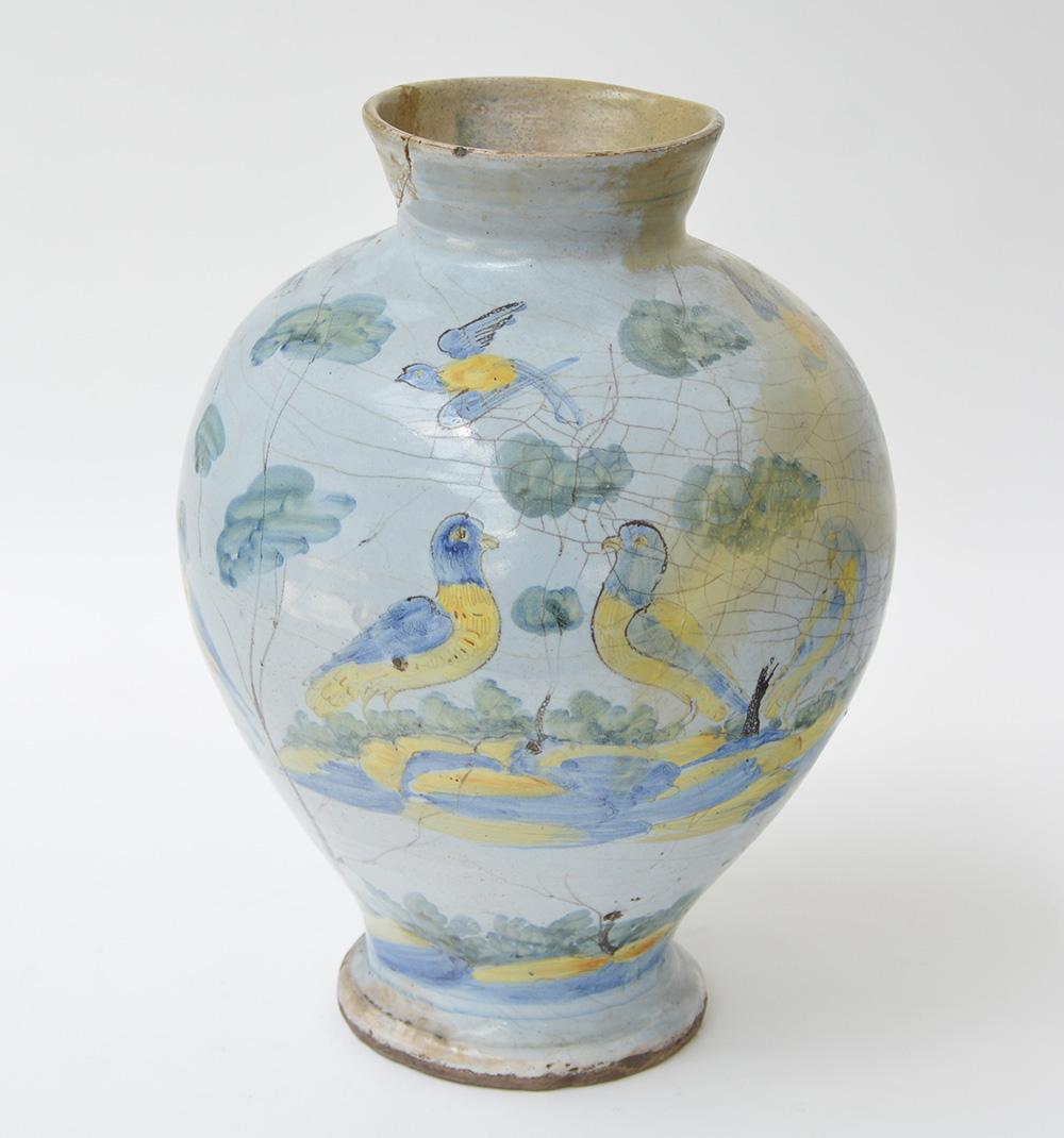 Vaso in terracotta dipinta in policromia a volatili in paesaggio (h. cm 33) (restauri)
