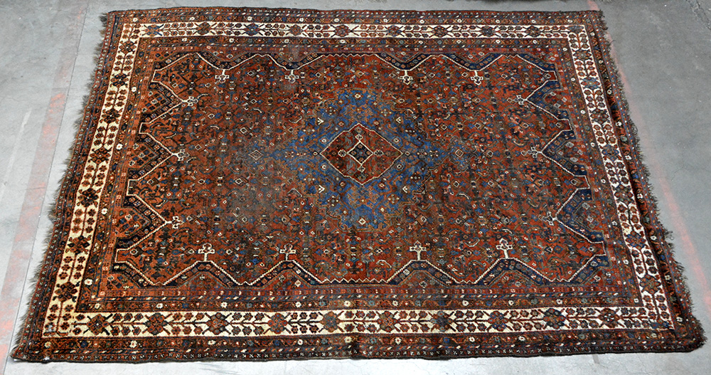 Tappeto Shiraz, Persia inizio sec. XX Disegno a medaglione blu su fondo rosso scuro, bordura floreale su fondo bianco (cm 310x235) (difetti e mancanze )