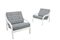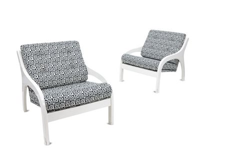 Coppia di poltrone in legno laccato bianco con rivestimento in tessuto a motivi optical.