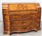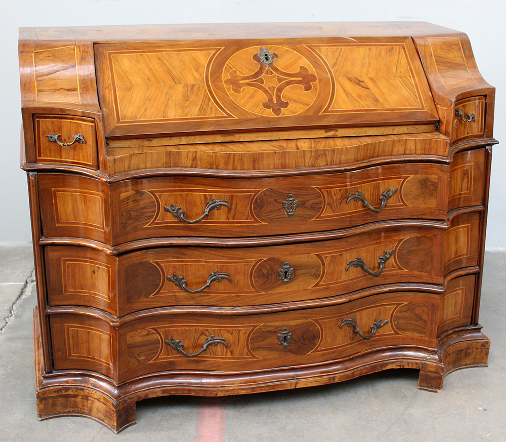 Ribalta lastronata in ulivo e radica di ulivo e filettata in legno chiaro, fronte sagomato a tre cassetti, anta ribaltabile celante sei cassettini e vano, piedi a mensola, Veneto secolo XVIII (cm 130x98x62)(difetti e restauri)