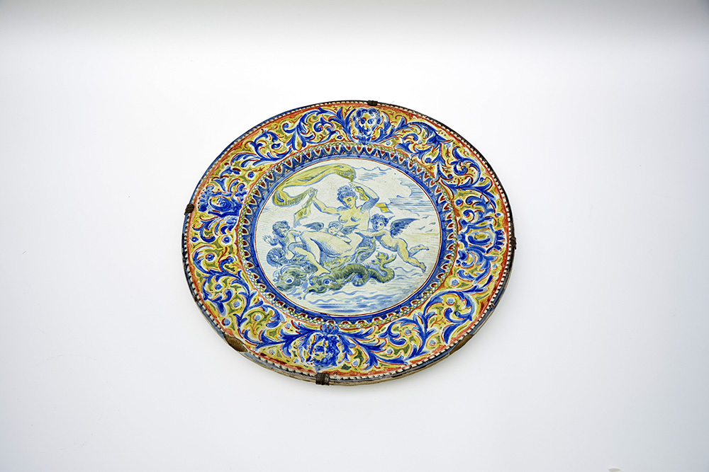 Manifattura secolo XIX. Piatto in terraglia decorato a scena allegorica nel cavetto e a stemma degli Sforza al retro (d. cm 47) (difetti)