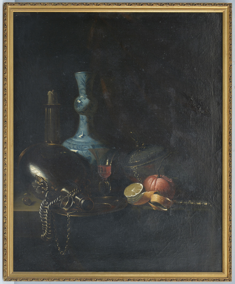 Ignoto del secolo XIX "Composizione con bottiglia e frutta" olio su tela (cm 73x59,5) in cornice (difetti)