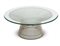 Tavolino rotondo, supporto in fili metallici cromati, piano in cristallo con bordo bisellato.