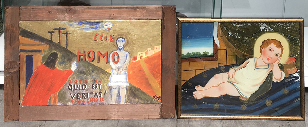 Lotto composto da un verre peint del secolo XIX raffigurante Gesù Bambino (cm 33x43) ed un ex voto ad olio su tela (cm 30x50), in cornici (difetti)